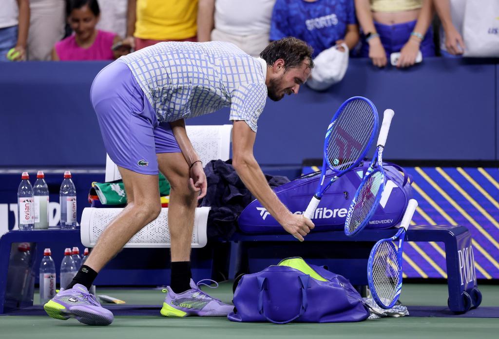 梅德维德夫怒砸球拍。